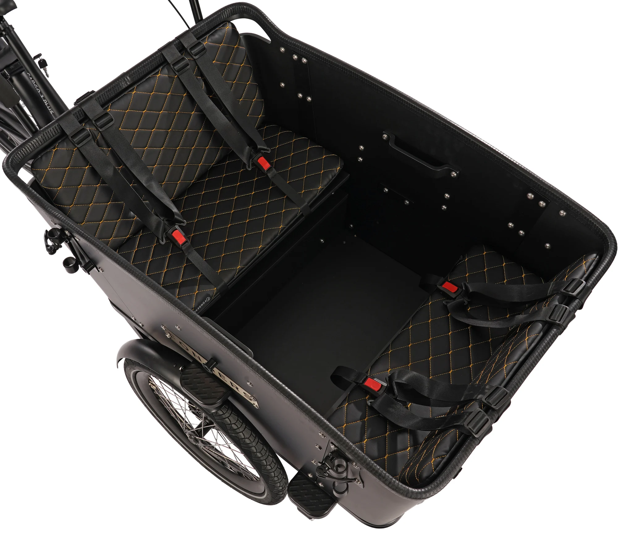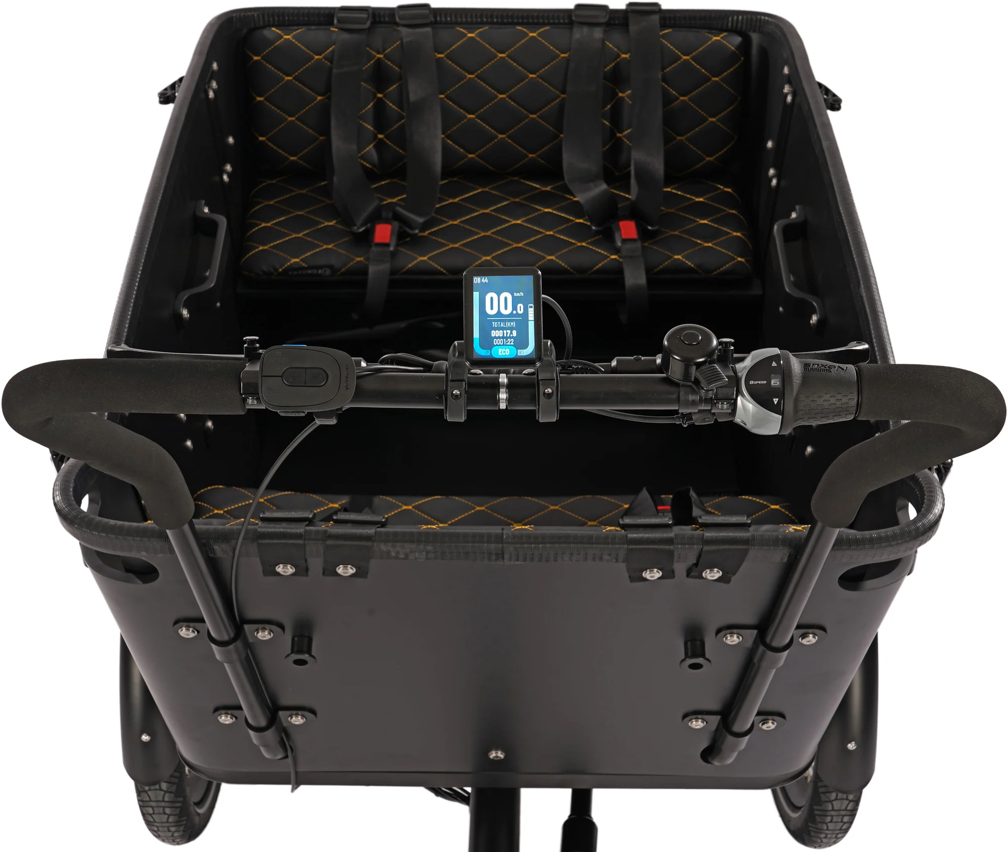 De Fongers Cargo 3 Plus 612 Wh Zwart Deluxe is voorzien van een stevig aluminium frame met een halfopen kettingkast. Hierbij zitten 7 Shimano Nexus naafversnellingen bevestigd, wat zorgt voor zorgeloos fietsplezier! Daarnaast is de Fongers bakfiets voorzien van een Motinova Pegasi Plus middenmotor, welke 100 Nm koppel levert. Dit zorgt voor een sterke ondersteuning in combinatie met 5 ondersteuningsstanden. De elektrische bakfiets is uitgerust met een 17 Ah/36 V accu voor een maximale actieradius van 70 kilometer. Daarnaast is de bakfiets voorzien van een Selle Royal gelzadel en CST anti-lek banden. Bovendien wordt met de bakfiets een huif meegeleverd, zodat uw kinderen niet nat worden van de regen en uit de wind zitten. Daarnaast is deze bakfiets geheel compleet én comfortabel door de luxe bakfietskussens.